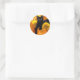 A circular sticker features a black cat with yellow eyes lying among pumpkins and sunflowers. The cat is positioned in the center of the image, with its body draped across the pumpkins. The pumpkins are bright orange, and the sunflowers have yellow petals and dark centers. The background is a mix of pumpkins and sunflowers, creating a festive and autumnal scene. The sticker has a glossy finish, and the colors are vibrant and saturated.