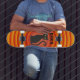 Smiling cat with funky orange background. Cool Skateboard - Custom option