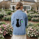 A silhouette cartoon of a black cat with green eyes. A green star hangs from the cat's tail.