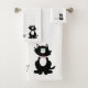 Bath towel set, consisting of a face cloth, hand towel and bath towel with a black cat design. You can customise this bath towel set with any text of your choice. Should you require any help with customising then contact us through the message link on this page. Black cat design bathroom towel set