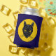 A retro-looking illustration of the face of a yellow-eyed black cat appears in a moon-like circle in this original Halloween-appropriate art by Richard H. Fay.