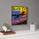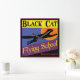 Black Cat Flying School Retro Halloween Art. A magical black cat flies across a blue sky with an orange moon. Unique Halloween art with a vintage art, crate label design by AngelCityArt.