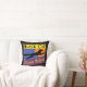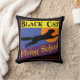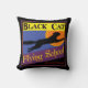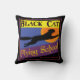 Black Cat Flying School Retro Halloween art pillow with a magical black cat flying across a blue sky with an orange moon, unique Halloween art with a vintage crate label theme.
