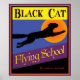 Black Cat Flying School Retro Halloween Art. A magical black cat flies across a blue sky with an orange moon, original vintage Halloween art with an antique crate label design by AngelCityArt.