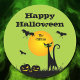Bats in the sky fly above a green eyed black cat and leering jack o' lantern on these Halloween party stickers. MATCHING items in our store.