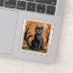 This captivating postage stamp features a sleek black cat with luminous yellow eyes, sitting attentively amidst two small pumpkins. The background depicts a classic Halloween scene with bare trees silhouetted against a full moon and an eerie orange sky. Perfect for sending spooky season greetings, party invitations, or for collectors who love feline and Halloween-themed designs, this stamp combines charm with a touch of mystery.