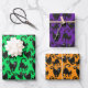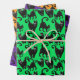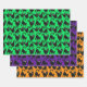 Black cat halloween wrapping paper set of 3 sheets, featuring a trendy cat pattern on a green, purple and orange color backgrounds. For matching products please browse the Black Cat Halloween Collection in my store.