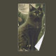 Standing by white and pink flowers is a black cat with a beautiful necklace, with the moon in the background.