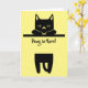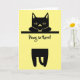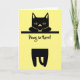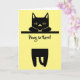This greeting card has a cute black cat hanging on a bar against a yellow background and words to encourage: Hang in there!