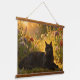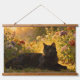 A black cat resting regally in a garden of colorful flowers, captured in warm, golden hour light. Rendered with the depth and texture of a classical oil painting.