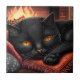 Black cat laying in front of a fireplace ceramic tile