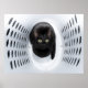 Black cat looking up from a white laundry hamper; a super cute kitty to brighten the day of all cat lovers. Suitable for home and work!