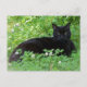 This postcard features one of my original photos of a black cat lying in green clover. The green clover with with white flowers is a nice contrast to the shiny black fur on this cat. A beautiful cat photo card for a cat lover.