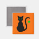 A cute cartoon of a black cat with green eyes on an orange background. A green star with five points dangles from the cat's tail.
