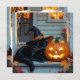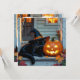 A cute Halloween card that you can personalize the message on. A cute ai illustration of a black cat napping on the front porch with a witch hat on, next to a jack-o-lantern on Halloween waiting for trick or treaters.