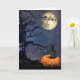 A fluffy, black cat sits on a pumpkin under a spooky tree, while gazing at the full moon on this lovely Halloween card. Very cute and charming card for the spooky night.