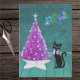 This tissue paper for your gift wrapping has a bright pink and silver Christmas tree on a star shaped white rug with a black cat in a big pink bow and Merry Christmas in colourful letters in a teal coloured room.
