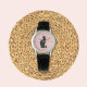 A cute watch with an original Mango Moon Studio graphic design. The watch face showcases a sleek black cat silhouette against a pale pink background, creating a delightful contrast that adds a touch of whimsy to your wrist.