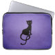 Black cat laptop sleeve with a beautiful illustration of a gracious evil black kitty with glowing eyes on a grunge textured purple background.