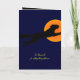 A custom folded invitation card with a magical black cat against a blue sky with an orange moon. Unique Halloween art with a vintage art, crate label design. Click Customize It to change fonts, add text, more.