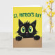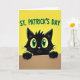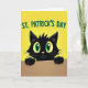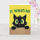 This card shows a stylized black cat centered and peeking over a warm, earthy brown ledge, its front paws resting on the edge as if it has just popped up to say hello. Behind it, a bright yellow background fills the scene, making the cat’s dark fur stand out sharply and giving the whole design a sunny St. Patrick’s Day lift ☘️. At the top, the words “ST. PATRICK’S DAY” sit in strong green letters, clearly separated from the cat below. The cat’s large emerald-green eyes draw you in with a teasing, friendly look, like it’s sharing a private joke with someone just out of frame 💚. A small pink nose and fine whiskers soften its face, adding a gentle, affectionate touch to the gaze. The simple layout keeps attention on the cat and the holiday title, with the brown ledge acting like a cozy stage across the lower portion. The final detail is the contrast of green holiday lettering above and the cat’s green eyes below against the wide yellow field.