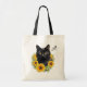 Cotton tote bag with black cat design. Add your first name initial in black at the top. The illustrated design features a black cat wearing a sunflower wreath. The design is printed on one side only, with optional handle colors.