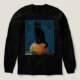 This t-shirt design features a black cat sitting sweetly on a large orange pumpkin, surrounded by spider webs that adorn the background. The cat character is depicted in a cute yet mysterious cartoon style, creating a unique and attractive Halloween atmosphere. The contrasting colors of black, orange, and purple create a striking yet aesthetic look. Perfect for those who like spooky yet adorable themes. This t-shirt is perfect for Halloween or for those who love cat-themed designs and light horror.