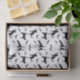 Simple black silhouette pattern of cat and bat silhouettes. One cat is stretching, another is just standing while a third one is reaching toward a flying bat. This design has a modern Halloween aesthetic for those who enjoy a minimal and stylish seasonal look.