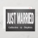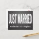 This wedding post card features a large Just Married announcement in a fun white chalk font highlighted against a black chalkboard background. The card can be personalized with the names of the bride and groom.
