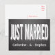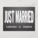 This wedding post card features a large Just Married announcement in a fun white chalk font highlighted against a black chalkboard background. The card can be personalized with the names of the bride and groom.