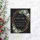 A black colored background decorated with cones, white berries and greenry. A faux gold oval frame. Personalize and add the details.