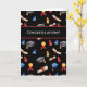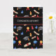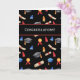 Cute black graduation card with a pattern of diplomas, black graduation caps, red and blue tassels and medals. At the top part of the pattern there is a white rectangle with red edges where the sentiment "Congratulations!" is displayed in white. Personalize the text with your own message if necessary or leave it as it is.