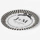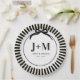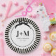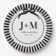 this design features a black bow surrounded by a black and white striped pattern. You can personalize with initials, names and a year.