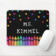 Teacher mouse pad personalized with the teacher's name beneath colorful stars and above a row of crayons in a rainbow gradient. Kindergarten teacher mouse pad in a colorful and fun design.