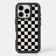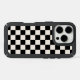 Rugged iPhone case features a bold black and cream checkered pattern. The geometric checkerboard pattern is made of rows of alternating beige and black squares. Other case styles and models also available in the sidebar.