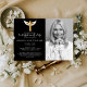 An Elegant and unique presentation for your celebration of life invitation with a cross at the top of the invitation and the custom black and white photo of the beloved deceased. the invitation comes also with calligraphy and a script to decorate it.