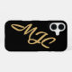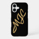 This black phone case features a minimalist, gold signature-style monogram placed diagonally across the cover. The initials are fully customizable and designed to flow naturally around the camera lens. Available in multiple color options for a clean, modern, and personal look.