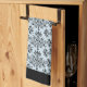 An elegant kitchen towel with a daisy damask pattern in black on light gray, with black edges. Customize It to change background colors, pick your fonts and add custom text and more, even save your design for later.