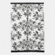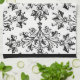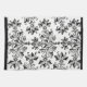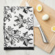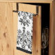 An elegant kitchen towel with a vintage daisy and leaf damask pattern in black with thin black edges.