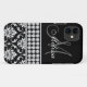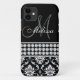 This monogrammed black and white damask iPhone 5 Case-Mate Case has a photo of this design embedded into the hard plastic cover. The design is made up of a black and white damask pattern, a print of three rows of white diamonds in a stripe and an area where you can add your name and monogram initial in gorgeous script fonts. This iPhone 5 case cover is the perfect way to accessorize your iPhone 5. Be stylish and girly all at the same time. Design by Elke Clarke©2012. Graphics licensed for use. You can "customize it" and chnge the background color and font.