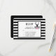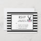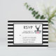 Wedding or other event RSVP card with a black deer head with large antlers. Geometric lines inside the face of the deer adds a creative touch. Colorful pink flowers and mint green leaves form a pretty floral bouquet below his head. A mountain range sketch placed amongst the flowers also adds to the rustic country feel. Background is a black and white striped pattern.