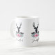A personalized coffee mug with a black deer head with large antlers. Geometric lines inside the face of the deer adds a creative touch. Colorful pink flowers and mint