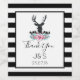 A wedding thank you bottle label. Thank you written in a trendy calligraphy font. Personalized with the bride & groom's initials and wedding date. Designed with a black deer head with large antlers. Geometric lines inside the face of the deer adds a creative touch. Colorful pink flowers and mint green leaves form a pretty floral bouquet below his head. A mountain range sketch placed amongst the flowers also adds to the rustic country feel. Background is a black and white striped pattern.