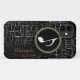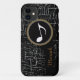 Craqueled black printed texture with a white musical note in a circle with a custom name