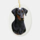 A black Dobermann Pinscher with natural ears (uncropped) on an ornament. To change the background color click Customize>edit>background and make it suitable for the holiday or decor of your choice.