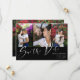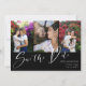 Double sided save the date card with three photos in a clean collage on one side and a larger photo on the other. Save the Date is written in a looser calligraphy style in white on black. Add your names and wedding information. On the back, you can add your wedding website too.