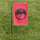 Flag bracket is super easy to assemble. There is a prong fork that goes into the ground. I dug a shallow hole to bury the prongs and still had enough height. Reinforced stitching on for the flag opening. Colors are true to the website. Mona Lisa's sign with the text is easy to read, the text is clear and not blurry.