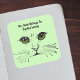 This square sticker bookplate label is light green with a black drawing of a cat face with big eyes and long whiskers. Customize the text and name with the template.