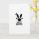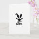 On the front of the card is a long-eared bunny silhouette 🐇 built from smooth black shapes on a bright white background, giving it a modern, high-contrast look. Two tall oval ears rise at the top, and one ear wears a small looping bow that reads like a sweet little gift. Rounded shapes near the center hint at a face and tiny paws, arranged so the figure feels like it’s leaning in with gentle, friendly affection. Across the black areas, tiny scattered white flecks add a soft, star-dusted texture that keeps the design from feeling too stark. Centered near the bottom, the greeting “HAPPY EASTER.” appears in uppercase, thick sans-serif letters in black. The text sits neatly beneath the bunny, leaving plenty of open space above, like a quiet pause in the layout 🌷. The bow is a simple black loop placed near the upper right side of the bunny’s head, just below the tip of the ear.