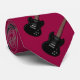 Guitar players neck tie. Bright burgundy tie covered with images of black, electric guitars. Musicians novelty tie has images printed on the front only, but the maroon, pinkish-red color is all over.